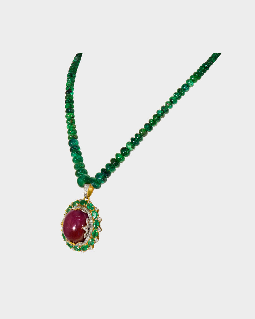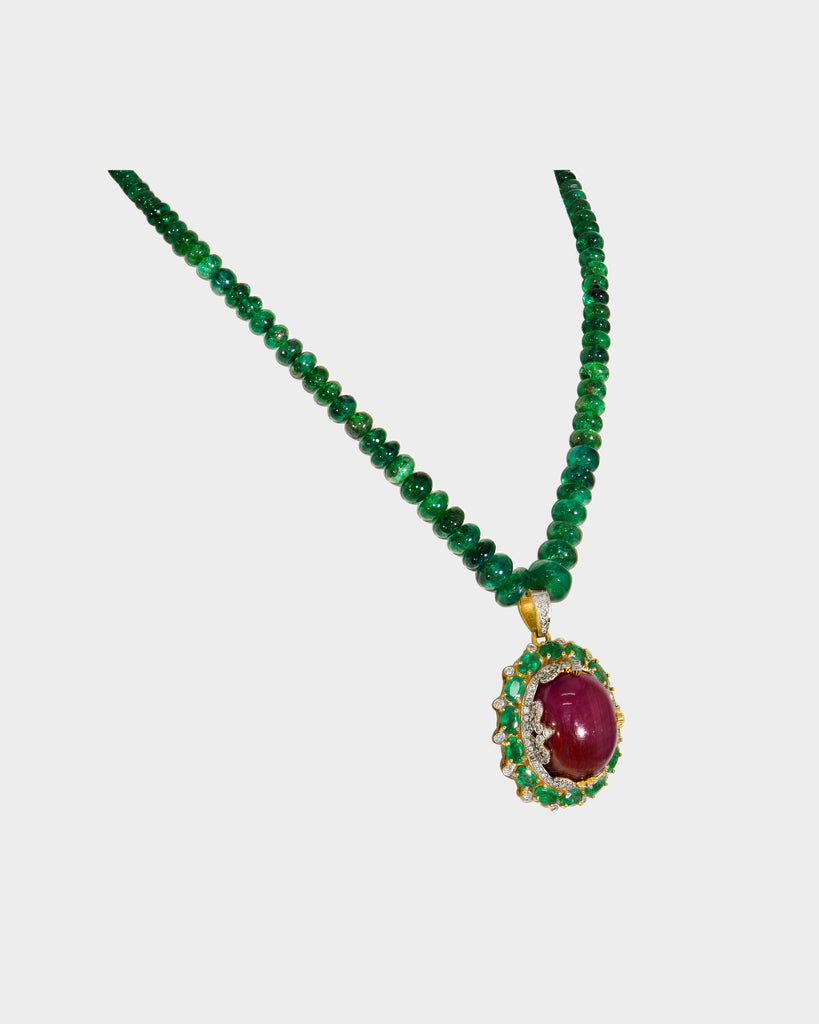 A captivating pendant featuring a ruby cabochon encircled by emerald-cut ovals and diamonds, strung with emerald beads for a bold fusion of colour, brilliance, and timeless luxury. (GDPE0408)