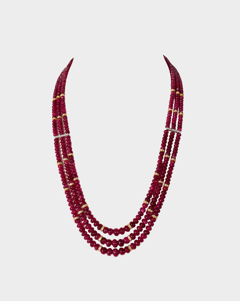 A luxurious three-layer necklace of premium Burmese ruby beads accented with diamond rondelles, showcasing rich colour, exceptional quality, and timeless elegance for a refined statement look. (STRG390)