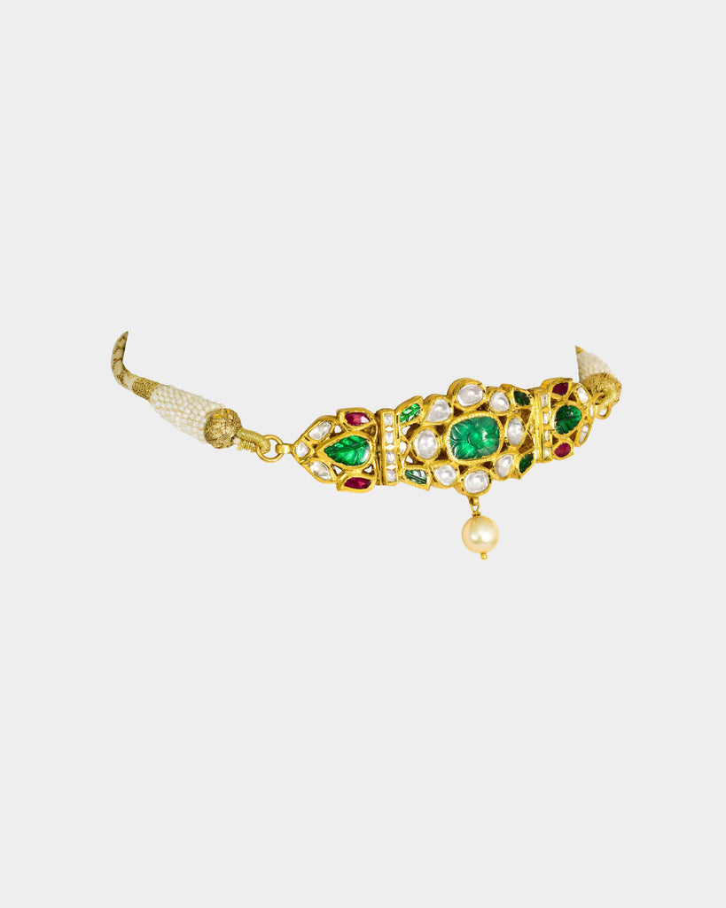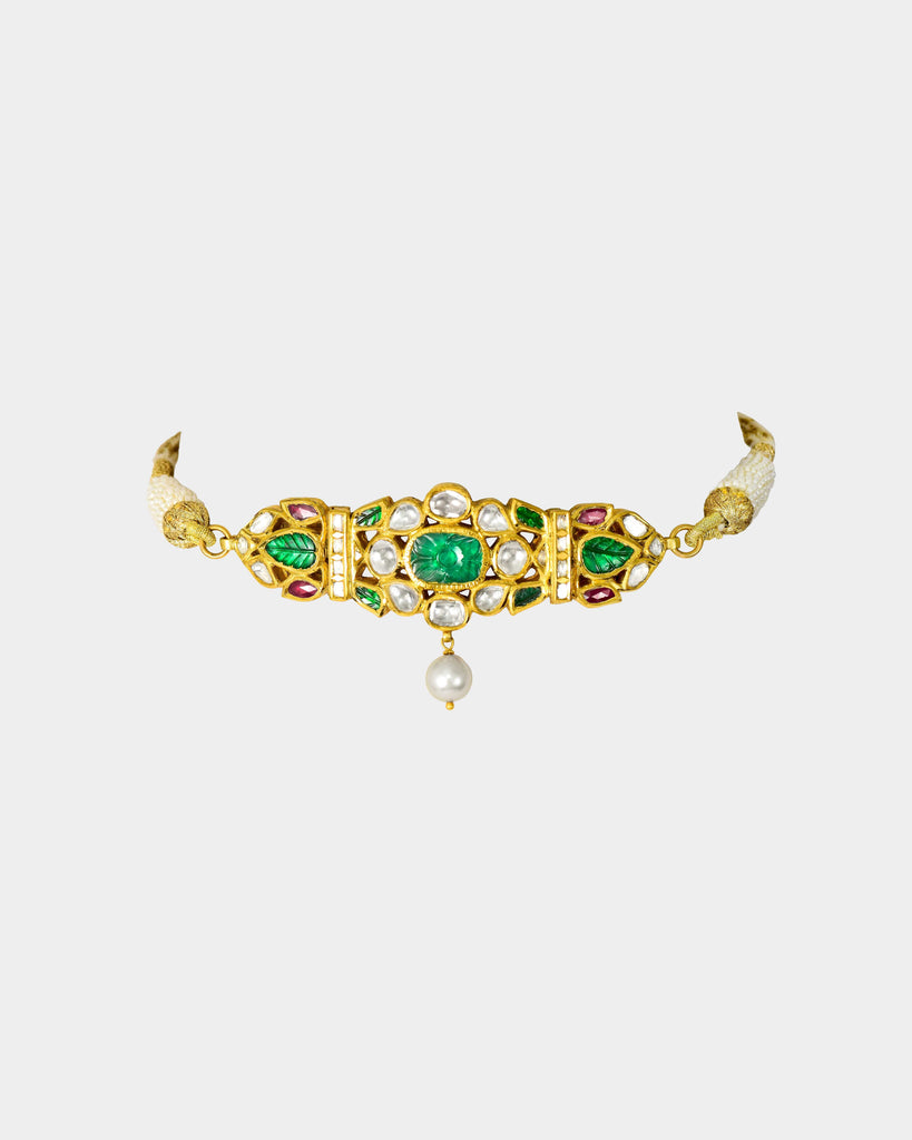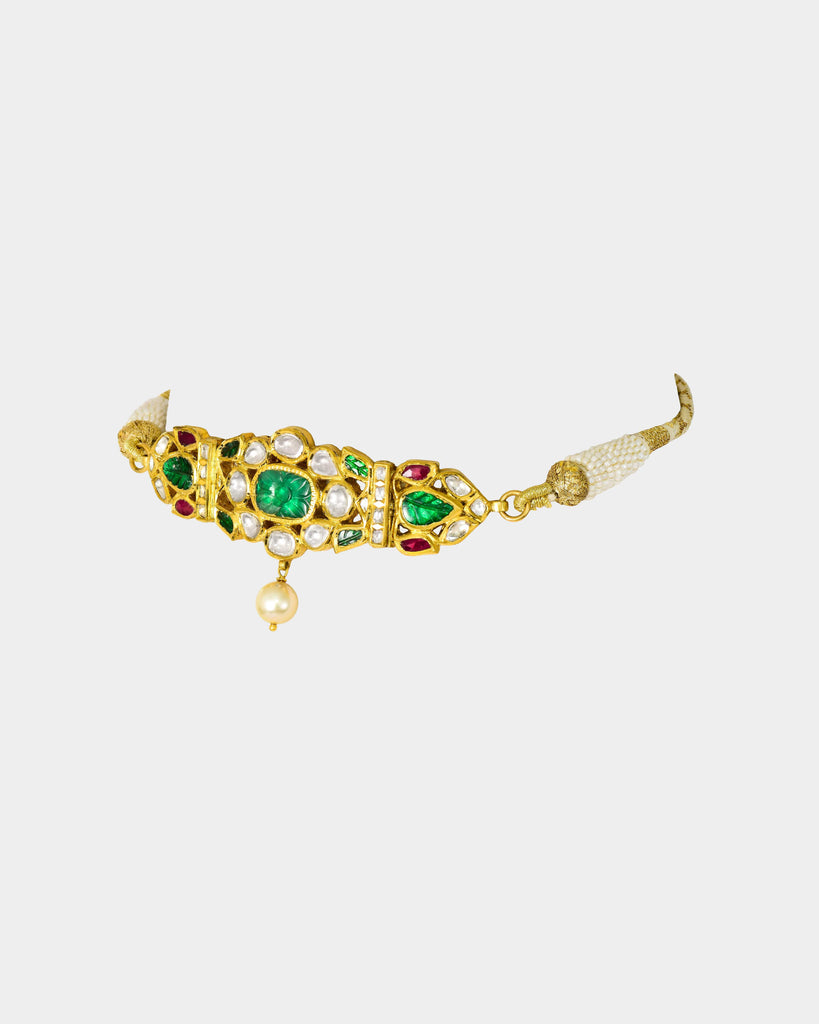 A mini necklace-cum-baju exquisitely crafted with diamond polki, carved emerald, and ruby accents, offering regal elegance with versatile traditional charm(KMNE3649)