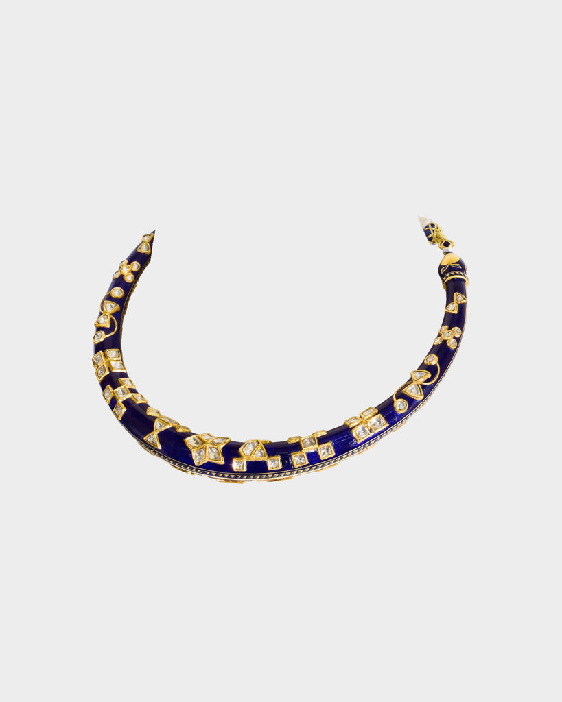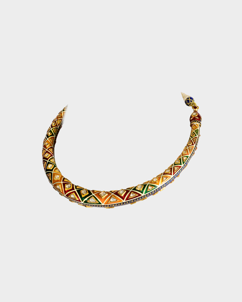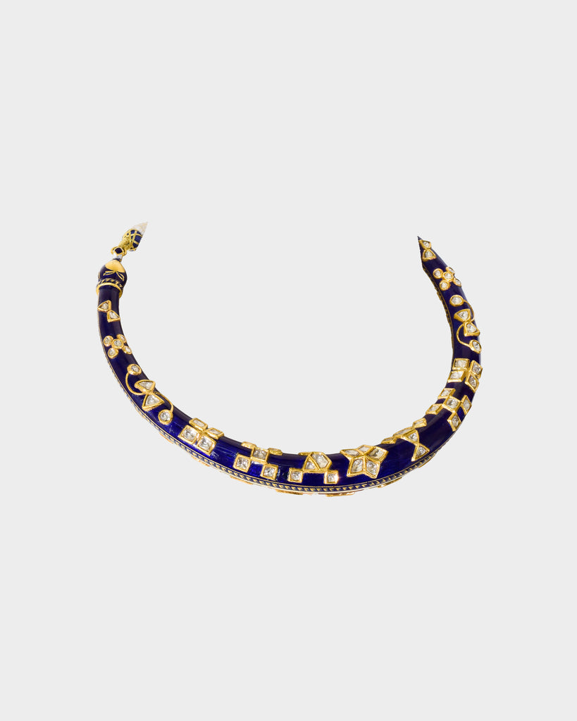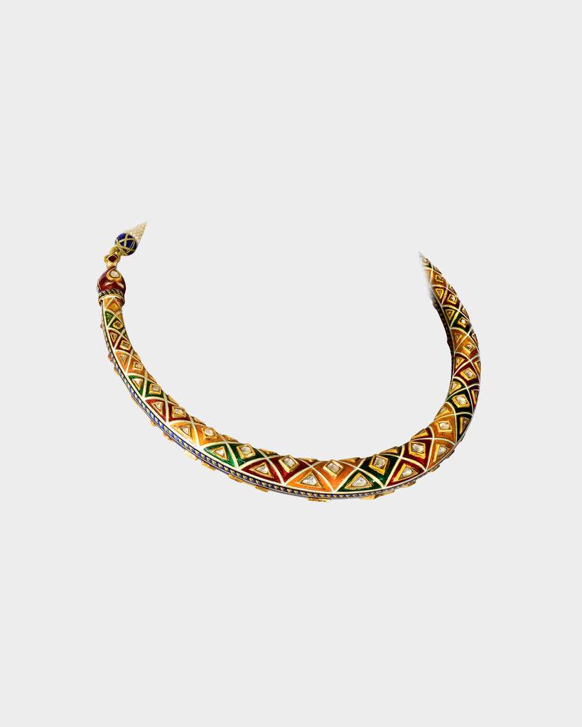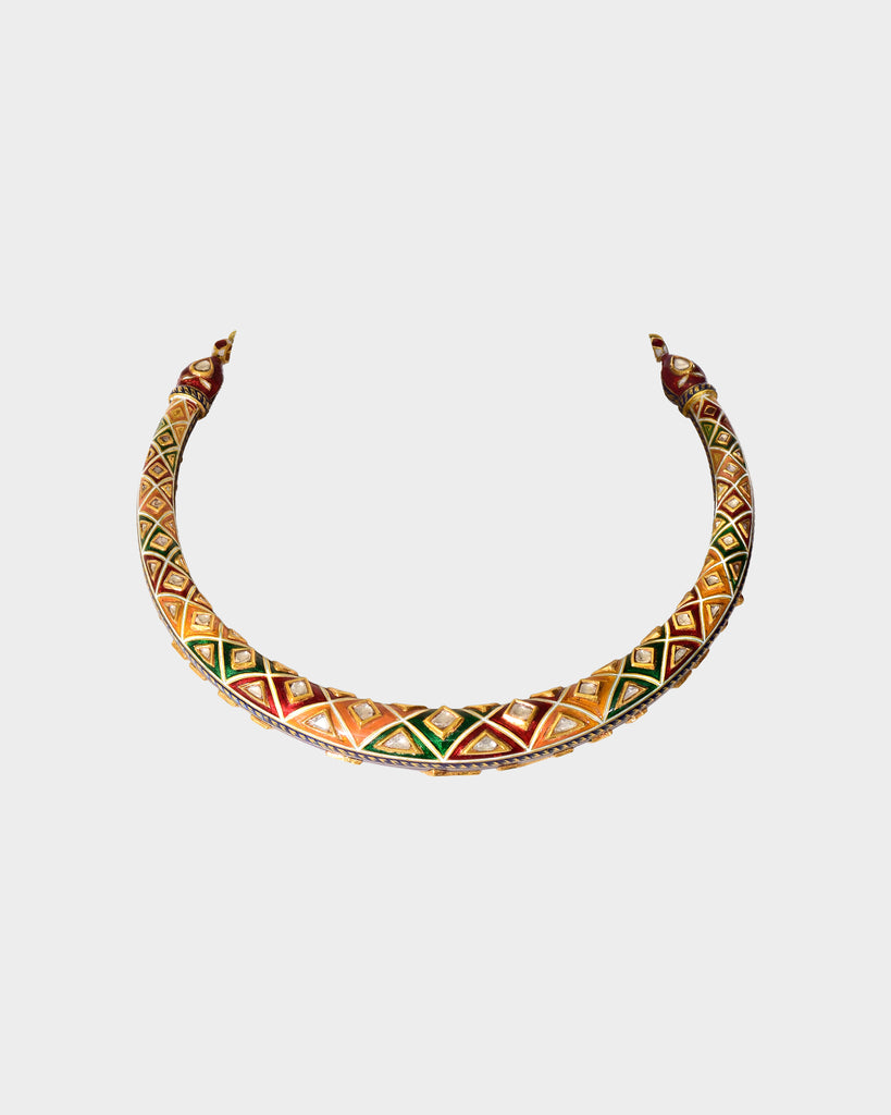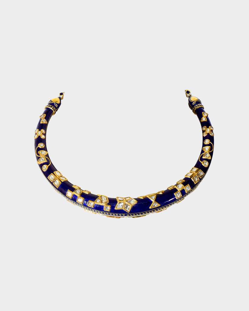 A traditional double-sided jadai halsi necklace crafted with diamond polki, showcasing intricate detailing and heritage artistry. A timeless statement reflecting royal elegance and classic Indian craftsmanship. (KMNE3685)