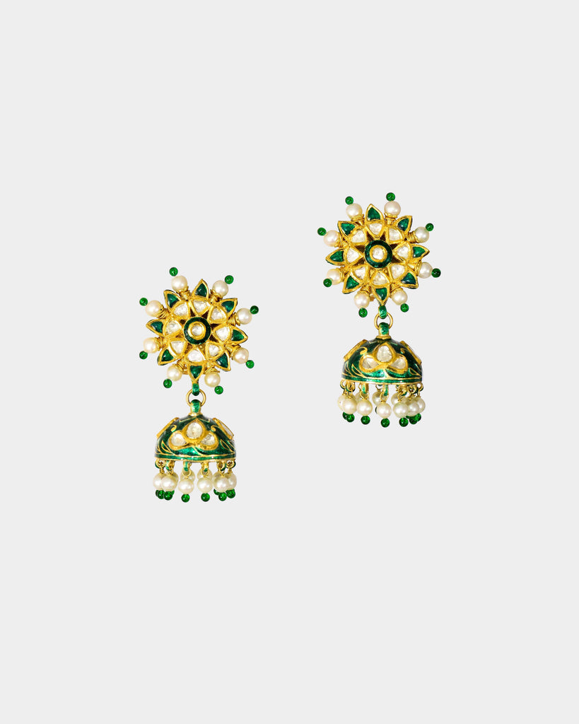 Elegant green enameled jhoomkis adorned with diamond polki and luminous pearls, blending heritage charm with modern grace. Perfect for weddings, festive occasions, and timeless luxury. (KME2457)