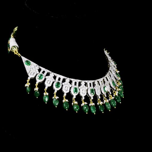 This elegant necklace set features sparkling diamonds and rich green emeralds, beautifully paired with emerald maniya stringing. A perfect blend of classic charm and modern design, ideal for weddings, parties, or special occasions. (GDNE0512)